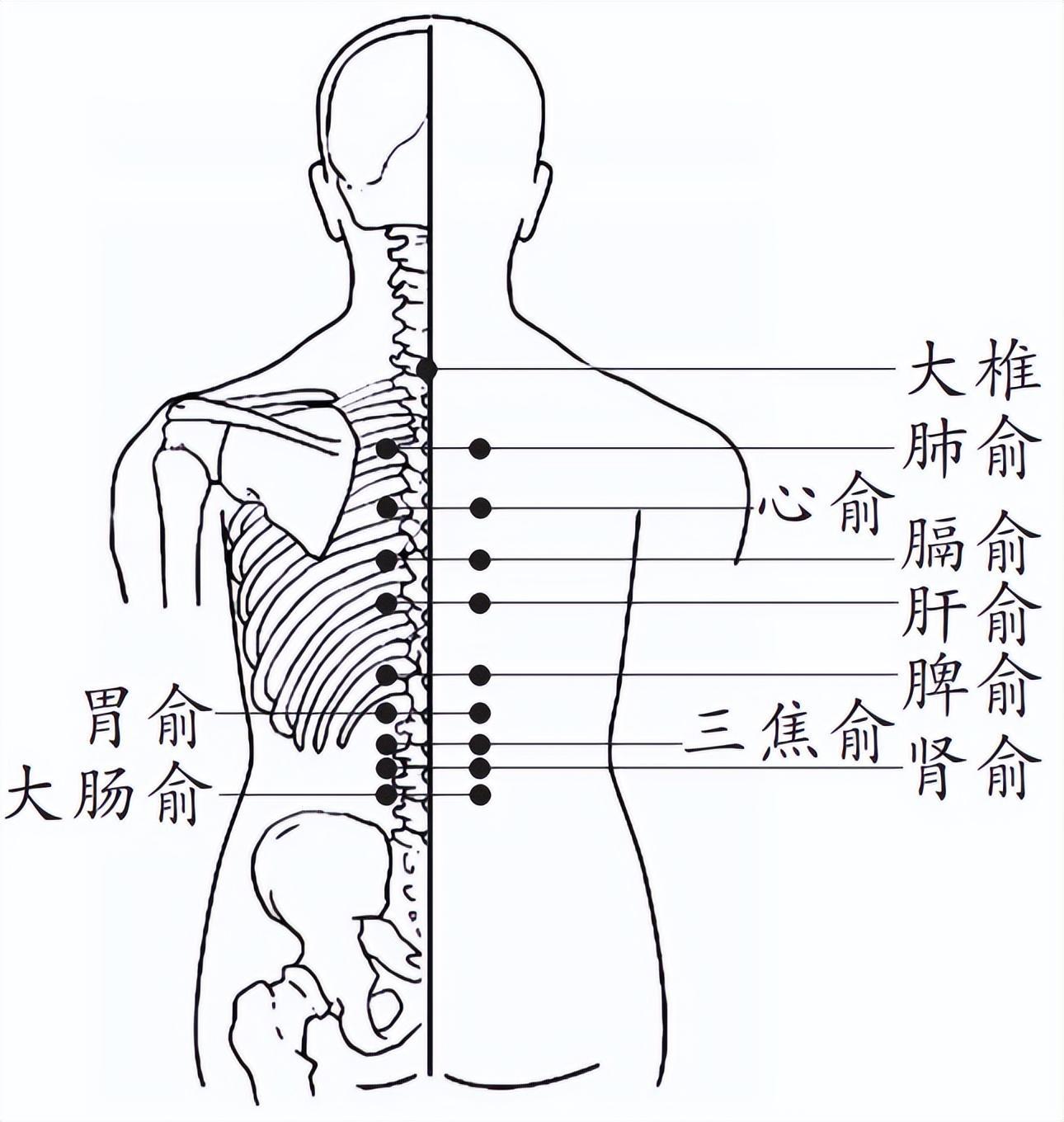 中醫認爲,人體的腹爲陰,背爲陽。背部有主一身陽氣的督脈和貫穿全身的足太陽膀胱經以及背俞穴。這些穴位分佈在膀胱經上,與五臟六腑相對應,反映內臟的生理和病理狀況。