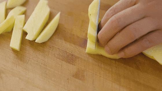 很多人習慣將切好的土豆片或土豆絲浸泡一下,能除去一部分澱粉,炒出來的土豆口感更脆。但這種做法會造成一部分營養溶於水流失。如果切絲,與浸泡水的接觸面積就越大,營養流失就會越多。所以,炒土豆,切片比切絲更容易保留營養。