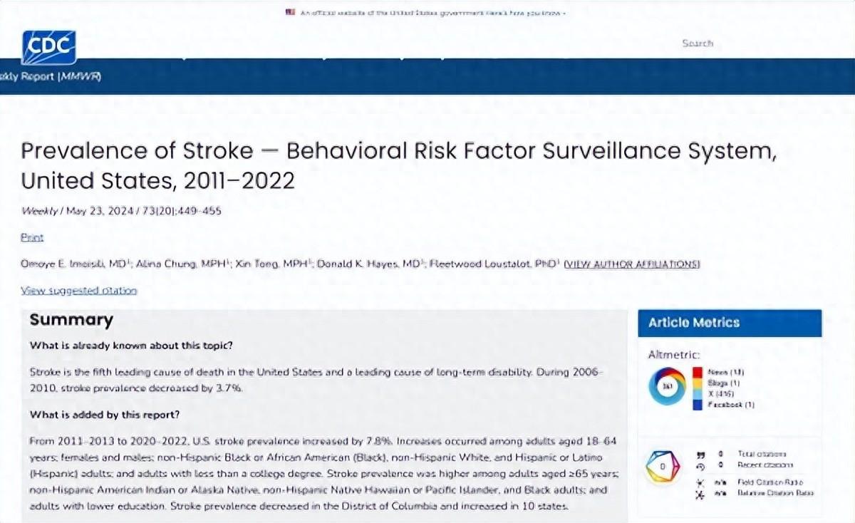 上述報告分析了2011年至2022年美國50個州和華盛頓特區的522.5萬名受訪者,發現美國中風的患病率從2011~2013年的2.7%上升至2020~2022年的2.9%,增幅爲7.8%,這一增長與2006~2010年中風患病率下降3.7%形成鮮明對比。單從數據來看,雖然2020~2022年期間,美國65歲及以上成年人的中風患病率最高(7.7%),18~44歲年輕人的中風患病率最低(0.9%),但從2011年到2022年,美國65歲以下成年人的中風患病率增加了約15%,其中45~64歲人羣增加了15.7%,18~44歲年輕人增加了14.6%,年輕化趨勢非常明顯。