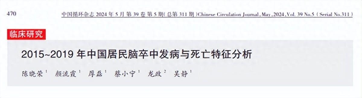 中國疾病預防控制中心慢性非傳染性疾病預防控制中心陳曉榮、吳靜等研究員基於我國居民急性心腦血管事件報告(試點)項目開展了這項研究,共覆蓋全國31個省、100個縣(市、區)的6000萬人口。作者指出,我國腦卒中仍處於快速增長期。儘管2019年腦卒中年齡標化發病率(523.82/10萬,即去除年齡影響因素後的發病率)比2015年下降了7.5%,但仍是全球平均水平(150.8/10萬)的3.5倍。從發病率看,2019年45~49歲、60~79歲年齡組的腦卒中發病率增幅在11%~13 %之間,50~59歲年齡組發病率增幅約爲4%;從死亡發病比看(即死亡人數與發病人數的比值),40~49歲和60~79歲年齡組在0.13~0.18之間,50~59歲年齡組最低,爲0.10,腦卒中增長的年齡分佈呈現明顯的“U”型特徵。