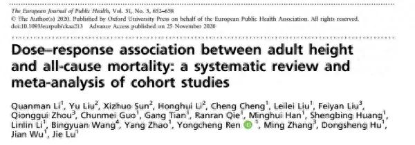 鄭州大學、深圳大學研究人員對約2億名參與者的數據進行分析發現,身高與全因死亡率之間存在U型關聯,這意味着,在某個特定身高範圍內,全因死亡風險相對較低,而偏離這個範圍,無論過高還是過矮,死亡風險都會增加。具體來說,男性全因死亡風險最低的身高約爲174釐米,女性則是158釐米;相較於最矮的身高(男性147釐米,女性137釐米),處於上述最佳身高的男性,全因死亡風險可降低47%,女性可降低33%。