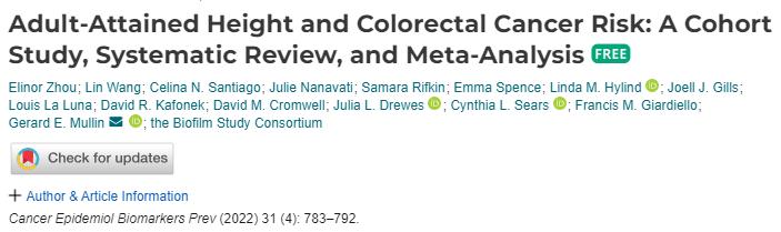 [4]Zhou E, Wang L, Santiago CN, Nanavati J, Rifkin S, Spence E, Hylind LM, Gills JJ, La Luna L, Kafonek DR, Cromwell DM, Drewes JL, Sears CL, Giardiello FM, Mullin GE; Biofilm Study Consortium. Adult-Attained Height and Colorectal Cancer Risk: A Cohort Study, Systematic Review, and Meta-Analysis. Cancer Epidemiol Biomarkers Prev. 2022 Apr 1;31(4):783-792.