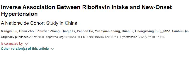 [1]《多補這種維生素,或能遠離高血壓!中國1.2萬人數據顯示,較高的維生素B2攝入與高血壓發病風險下降26%有關 | 臨牀大發現》. 奇點網 2020-11-04