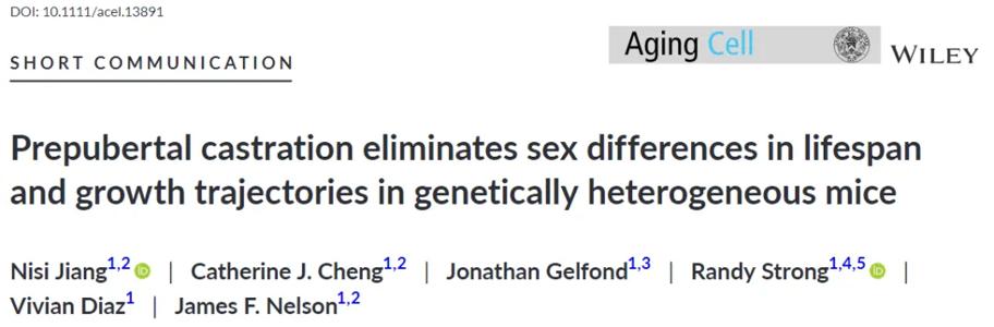 無獨有偶,James Nelson教授帶領的科研團隊在《Aging Cell》期刊上發表了一項研究也指出,在青春期前進行閹割的雄性小鼠,它們的壽命和雌性小鼠不相上下。