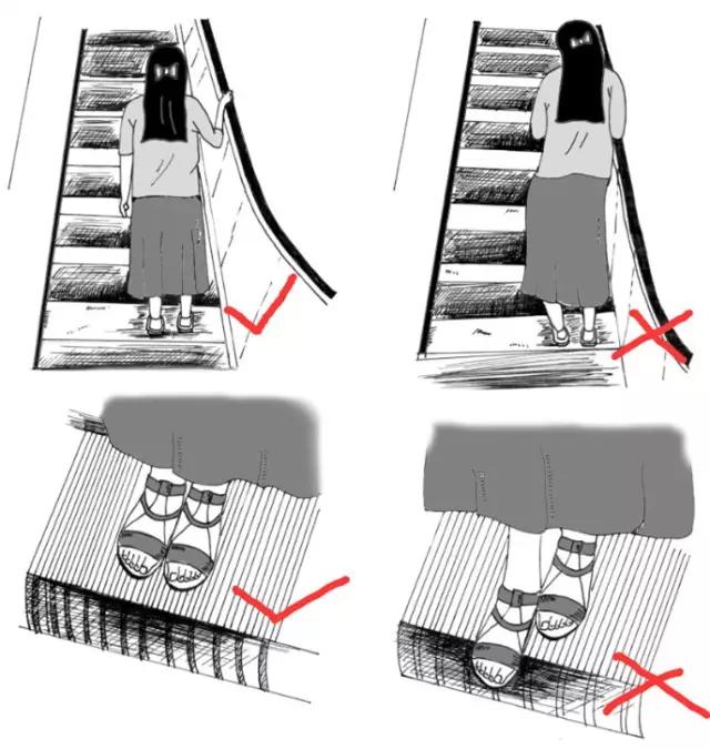 穿長裙乘坐扶梯,尤其當人倚靠在側板上時,隨着扶梯的運行,裙襬搖晃不定,稍不留神,長裙就可能被捲進扶手帶內。