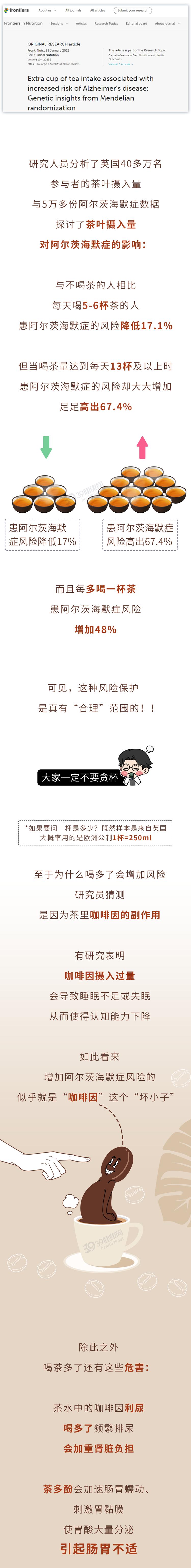 [1]Sun Y, Liang Z, Xia X, Wang MH, Zhu C, Pan Y, Sun R. Extra cup of tea intake associated with increased risk of Alzheimer''s disease: Genetic insights from Mendelian randomization. Front Nutr. 2023 Jan 25;10:1052281. doi: 10.3389/fnut.2023.1052281. PMID: 36761219; PMCID: PMC9905237.