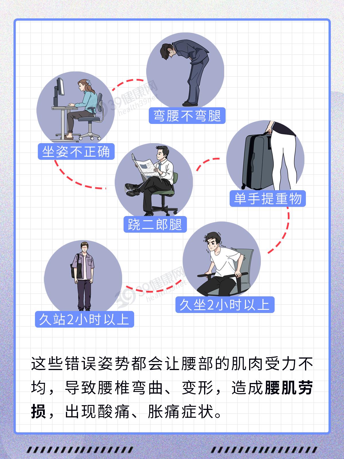 這些錯誤姿勢都會讓腰部的肌肉受力不均,導致腰椎彎曲、變形,造成腰肌勞損,出現痠痛、脹痛症狀。