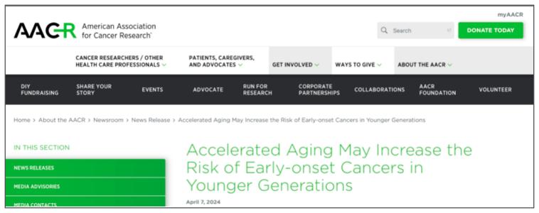 2024年4月,美國癌症研究協會發表的一項研究指出,年輕人或正在加速衰老,並且加速衰老與癌症風險增加有關。