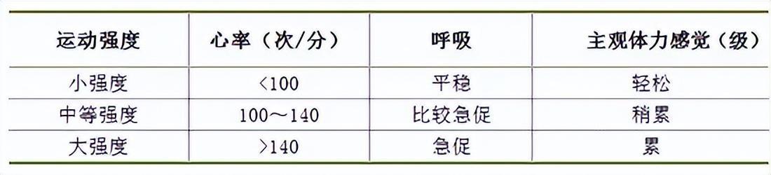 中等強度:60%~85%最大心率範圍,實測心率在100~140次/分範圍;大強度:85%或以上最大心率,實測心率達到140次/分以上。