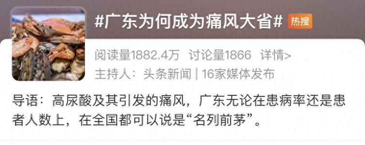 最近,廣東省在社交媒體上意外走紅,因爲它的痛風患者人數居於全國首位,榮獲了“痛風大省”的稱號。