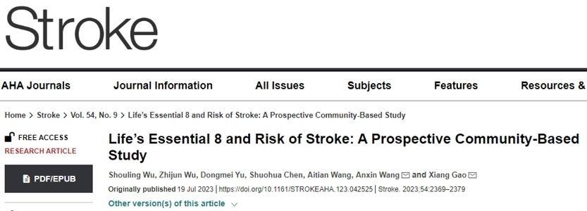 2022年,美國心臟協會將睡眠健康納入了生命八要素,包括飲食、身體活動、吸菸狀況、睡眠4個行爲因素以及BMI、膽固醇、血糖、血壓4個代謝因素。目前,LE8心血管健康評分與未來中風時間的相關數據有限。