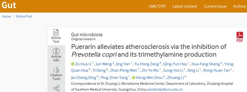 原來,今年南方醫科大學李壯團隊在Gut上發表了關於葛根素實現緩解動脈粥樣硬化的研究論文,該研究發現葛根素可以抑制Prevotella copri 及調節腸道菌羣,減少三甲胺的產生,來緩解動脈粥樣硬化。