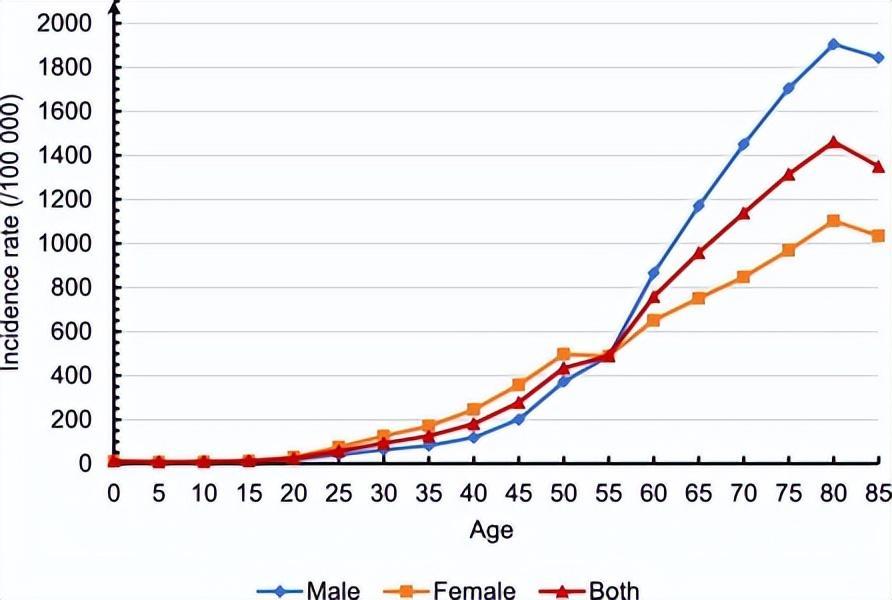 中老年人羣一直是各類癌症的目標人羣。根據《2022年中國惡性腫瘤疾病負擔數據權威發佈》的數據顯示,全癌種的發病率從35-39歲年齡組明顯增加,在80-84歲年齡組達到峯值。其中,男性在25-54歲的發病率低於女性,在60歲以上則高於女性。