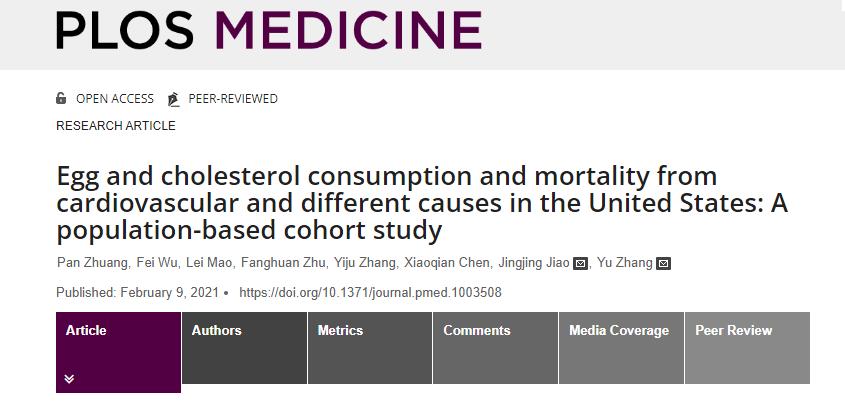 浙江大學生物系統工程與食品科學學院的研究人員曾在《PLOS Medicine》上發表過一項研究,研究人員對美國NIH-AARP飲食與健康研究內超52萬名受試者數據進行了分析,評估雞蛋、膽固醇攝入與全因/特定病因死亡率之間的關聯,並進行了平均16年的隨訪,在調整飲食、人口統計學特徵等因素後。