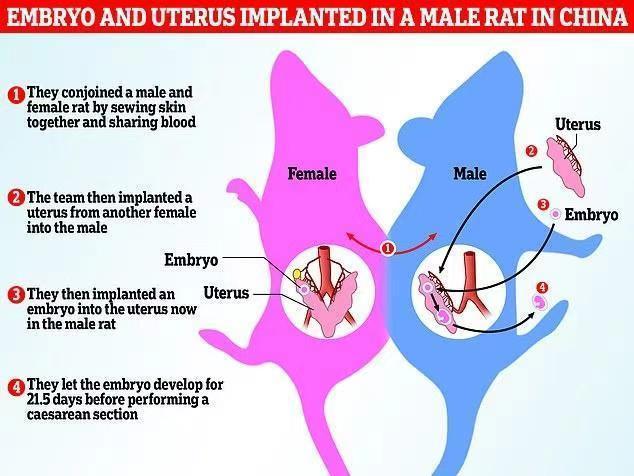 第二步,在共生8周後,將一個子宮移植到雄鼠的身體裏。