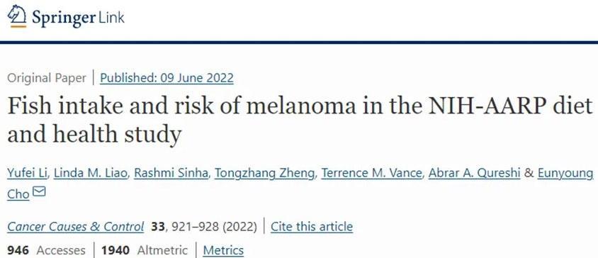 2022年,發表在《Cancer Causes & Control》上的一項針對近50萬人魚類總攝入量與健康的大型長期研究,通過統計參與者對油炸魚、非油炸魚、金槍魚罐頭的攝入量與最終出現的黑色素瘤風險進行分析後,發現較高的魚類攝入量確實會增加惡性黑色素瘤和原位黑色素瘤發病風險。