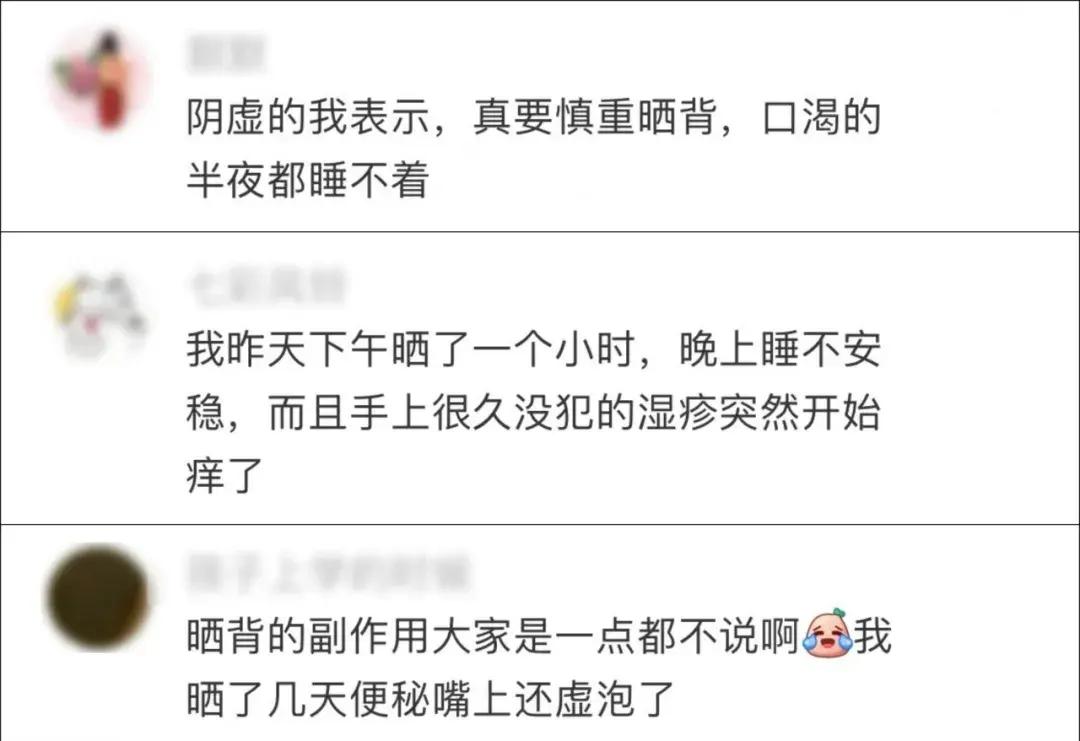 但有網友表示,曬背要看體質,不是人人都適合,會影響睡眠質量,還有曬傷、中暑的可能。
