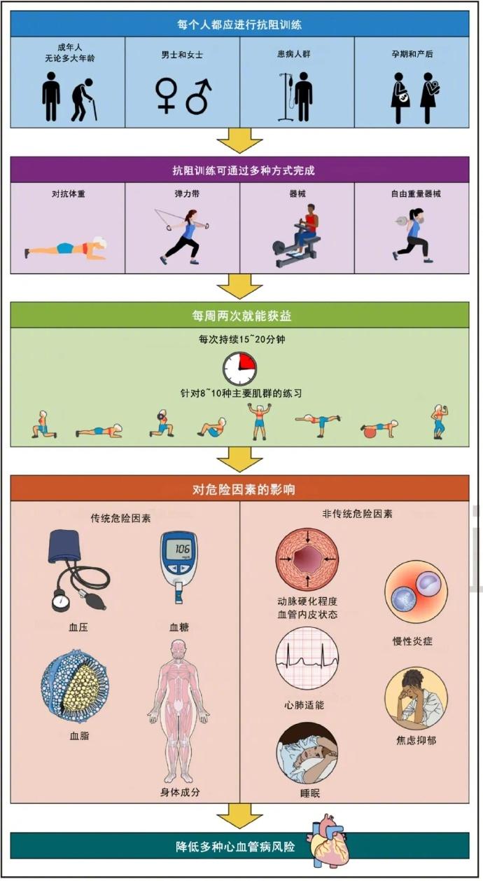 該聲明梳理總結了抗阻訓練對改善血壓、血糖、血脂和身體成分等心血管病危險因素的益處。