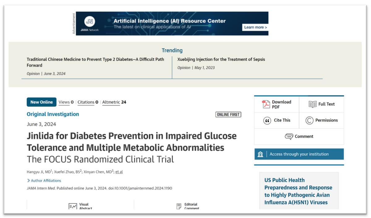 近期,國際醫學期刊《美國醫學會雜誌·內科學》(JAMA Internal Medicine,影響因子39)上就發表了一篇名爲《津力達對糖耐量異常合併多代謝紊亂人羣的糖尿病預防效果——FOCUS隨機臨牀試驗》的論文,它介紹了創新中藥津力達在代謝綜合徵糖耐量異常患者病情干預中發揮的作用。