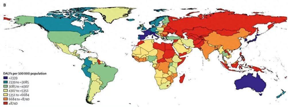 這張圖展現的是2017年世界範圍內因爲飲食結構不合理引發的死亡率。按照左邊的圖例,紅色區域形勢最嚴峻,然後是橙色,黃色次之。對照這個圖例可以發現,長壽大國日本大部分地區都是程度最輕的紫色,中國則大部分地區都處於第二階梯的橙色。