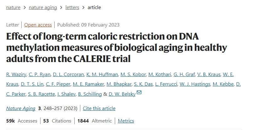 2023年2月,哥倫比亞大學和北卡羅萊納大學教堂山分校的研究人員發表在《Nature Aging 》雜誌上的一項關於減少能量攝入的長期綜合評估試驗的研究指出,熱量限制可以延緩健康成年人的衰老速度,降低相對死亡風險。