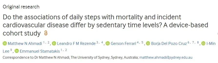 研究人員分析了英國生物銀行數據庫中72174名參與者,平均年齡爲61歲,女性佔58%,記錄參與者每日步數和久坐時間的數據。在平均7年的隨訪期間,共記錄了1633人死亡和6190起心血管事件。
