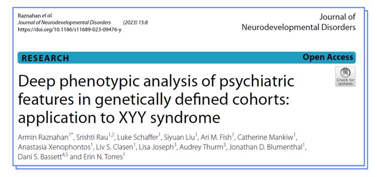 [2]Raznahan, A., Rau, S., Schaffer, L. et al. Deep phenotypic analysis of psychiatric features in genetically defined cohorts: application to XYY syndrome. J Neurodevelop Disord 15, 8 (2023).