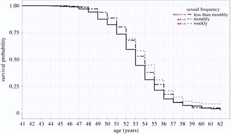 (圖爲:不同性生活頻率下的自然絕經年齡曲線)