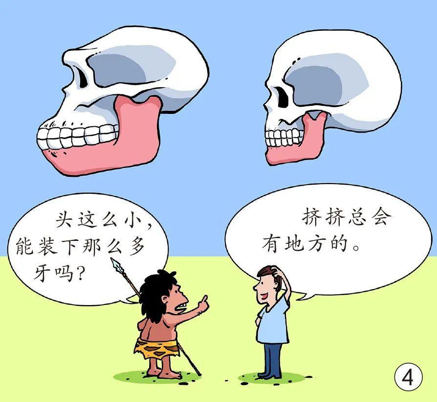 達爾文說:“物競天擇,適者生存。”人類在進化過程中,從爬行到直立行走,腦袋在逐漸變小,但因爲大腦要發育,變得更智慧,顱骨反而要擴充容積,所以只能把變小的重任託付給另一塊重要的骨頭——頜骨。