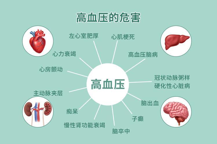 血壓長期過高會引起腎小球壓力增加,腎臟容易因此而出現功能性損傷,發展到後期會導致腎衰,終末期就是我們常說的尿毒症;血壓過高會讓心臟排血阻力增加,導致心室壁肥厚,讓心臟的正常泵血受到影響,嚴重時可導致心衰;並且血壓過高會促進斑塊生成,容易讓血管狹窄,增加心肌缺血、冠心病的發生率。