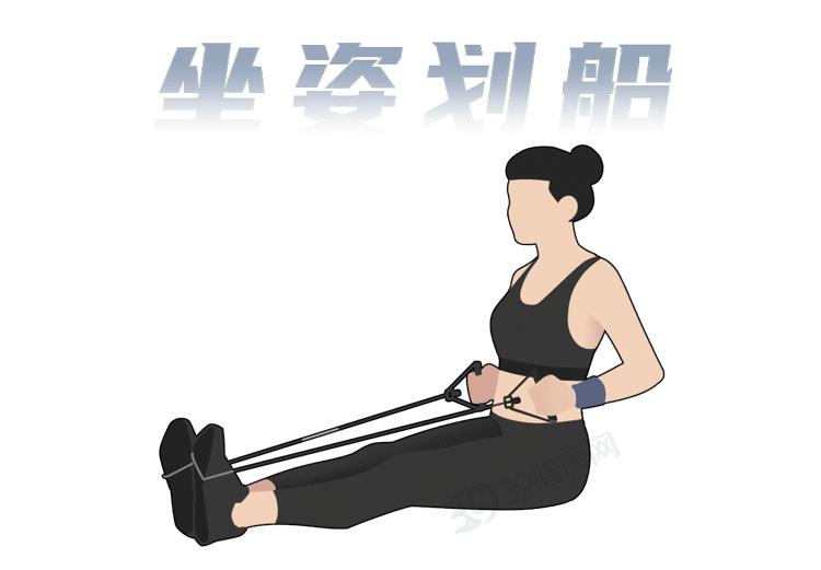 伸腿坐着,拿彈力帶卡在腳上,肩背部用力,帶動胳膊拉動彈力帶(不要把力全讓胳膊使)。