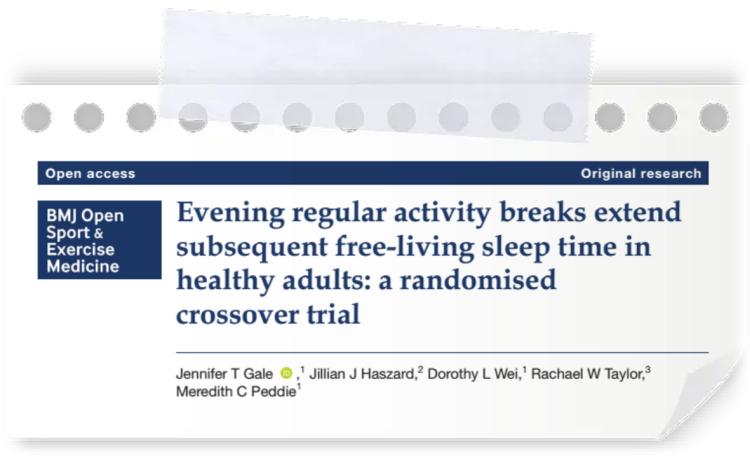 [1]Gale JT, Haszard JJ, Wei DL, et alEvening regular activity breaks extend subsequent free-living sleep time in healthy adults: a randomised crossover trialBMJ Open Sport & Exercise Medicine 2024;10:e001774. doi: 10.1136/bmjsem-2023-001774