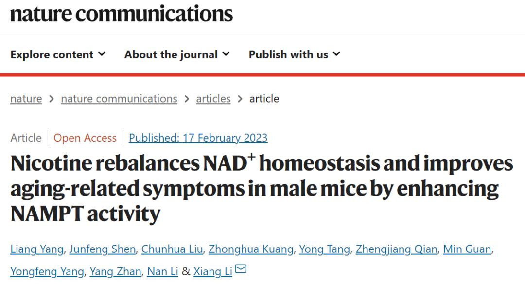 該說法來源其實主要源自於去年中國科學院深圳先進技術研究院腦認知與腦疾病研究所李翔團隊發表在《自然》子刊上的一項論文研究。研究稱,小鼠保持飲水內低劑量攝入尼古丁,可以讓小鼠的死亡率降低40%,顯著改善NAMPT活性和NAD+合成,以此達到改善雄性小鼠糖代謝、認知功能以及衰老症狀的作用。