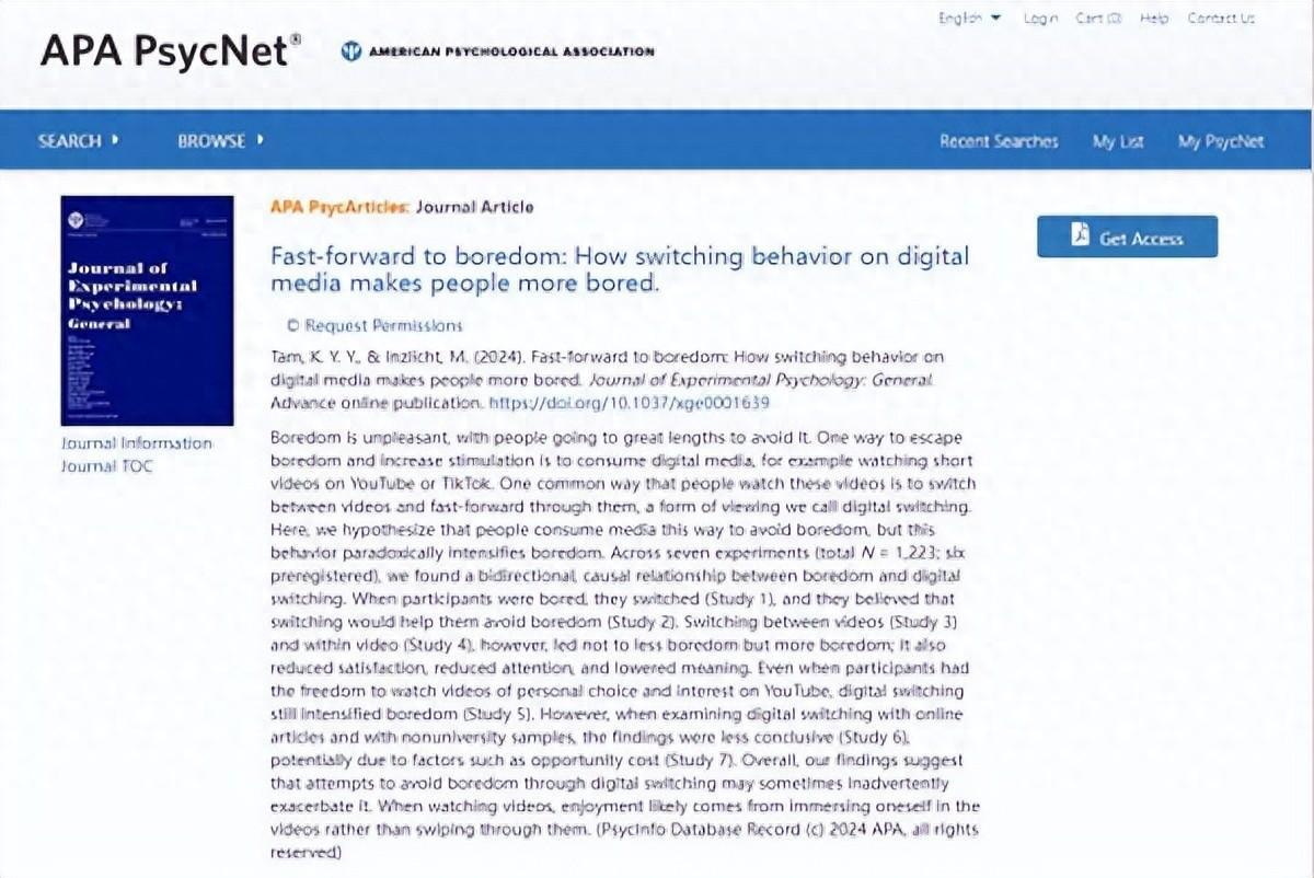 加拿大多倫多大學等機構的研究人員薈萃分析了7項相關研究,共涉及1223位受訪者。研究人員把看短視頻和快進觀看長視頻定義爲數字切換。結果發現,無聊和數字切換之間存在雙向因果關係,即當人感到無聊時,他們會進行數字切換,以尋求樂趣;然而這種行爲只會加劇無聊情緒,同時還會導致獲得感降低。即使參與者可以自由選擇感興趣的視頻,數字切換仍然加劇了無聊感。在一項10分鐘的測試中,參與者表示,與從頭到尾看一個視頻相比,在7個不同視頻之間切換會更無聊,更長的觀看體驗更有收穫。