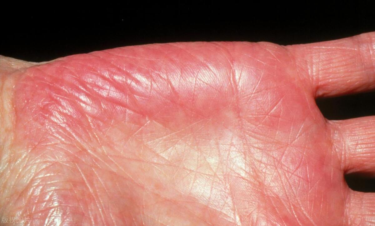 掌心處異常發紅,按壓後紅色可消失是肝掌的表現,一般跟肝臟病變相關。當肝臟功能下降,導致雌激素無法正常滅活,它們就會在體內會擴張血管,導致肝掌出現。