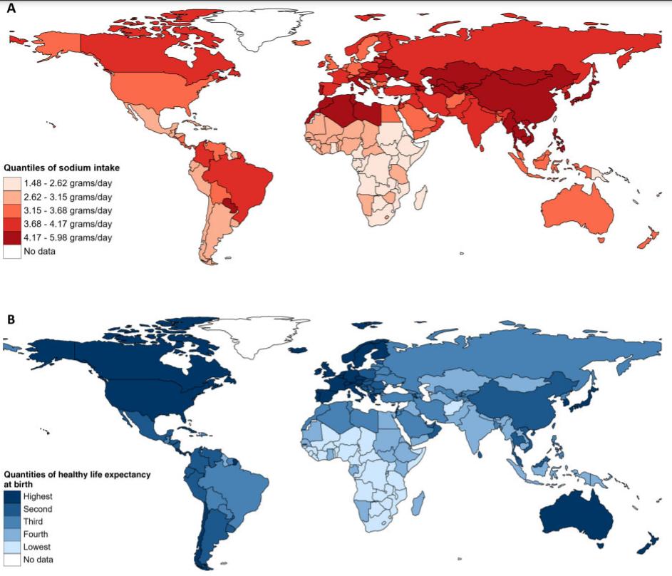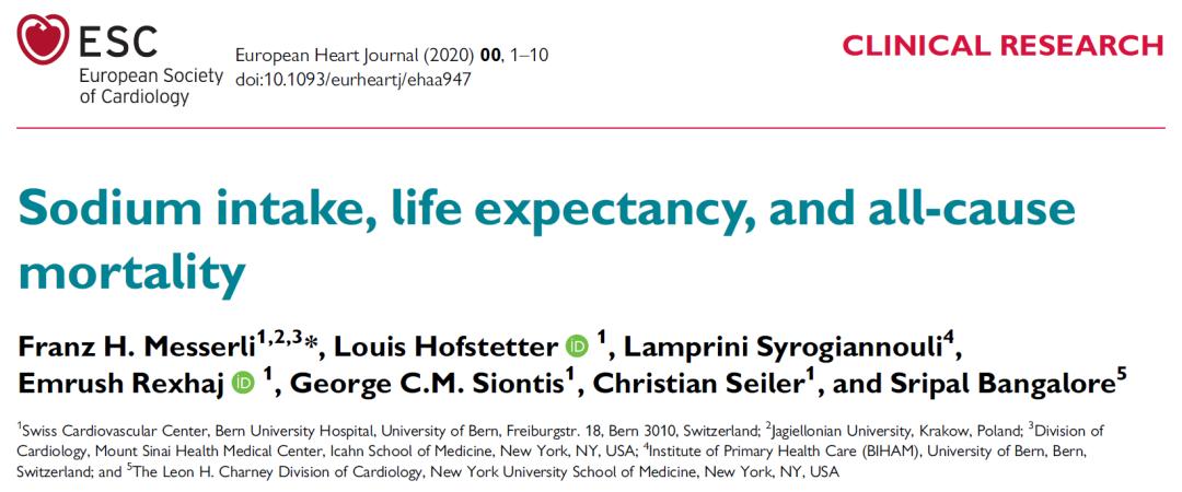 《歐洲心臟雜誌》上發表過一項由瑞士伯尼爾大學進行的研究,研究人員對181個國家的數據進行了統計,結果發現鈉攝入量增加與平均預期壽命延長、全因死亡率下降相關。