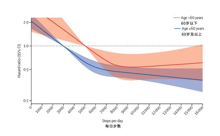 而且不同年齡層,對應的死亡風險最低步數也不一樣,超過60歲的老年人羣每天走6000-8000步最佳;60歲以下的成年人,每天走路8000-10000步最合適。