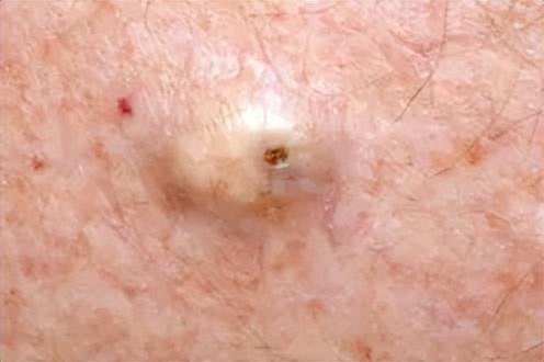 一般不痛不癢,外觀呈圓形、隆起性結節,摸起來柔軟有彈性,通常呈皮膚色或青灰色,部分中央有深色的小凹點,可擠出“豆渣樣”物質。