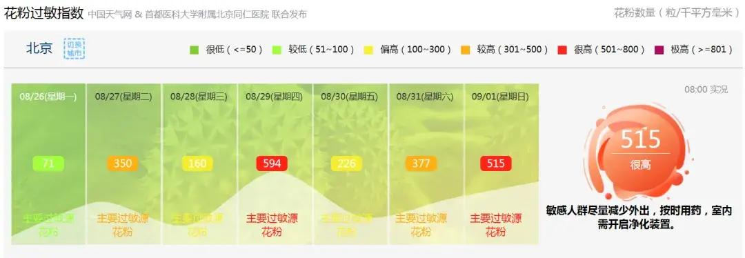 據北京世紀壇醫院變態反應中心花粉研究室預計,今年秋季花粉高濃度集中爆發期將從8月中旬持續至9月中旬。