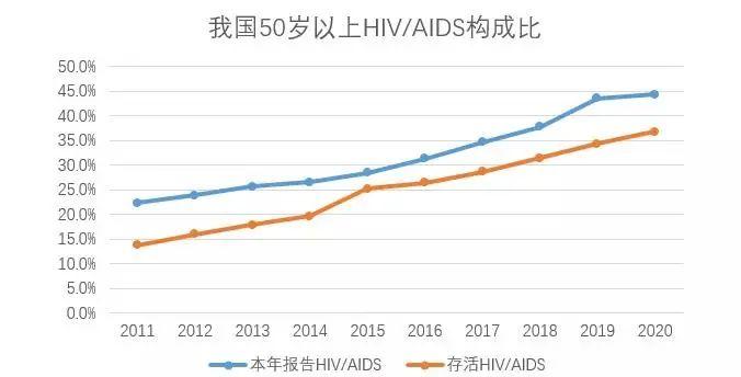 反觀過去的十年,我國老年艾滋確診比例呈現持續升高趨勢,據中國艾滋病/性病預防控制中心統計,男性60歲及以上新發確診艾滋比例自2010-2020年從7.41%升至18.21%。