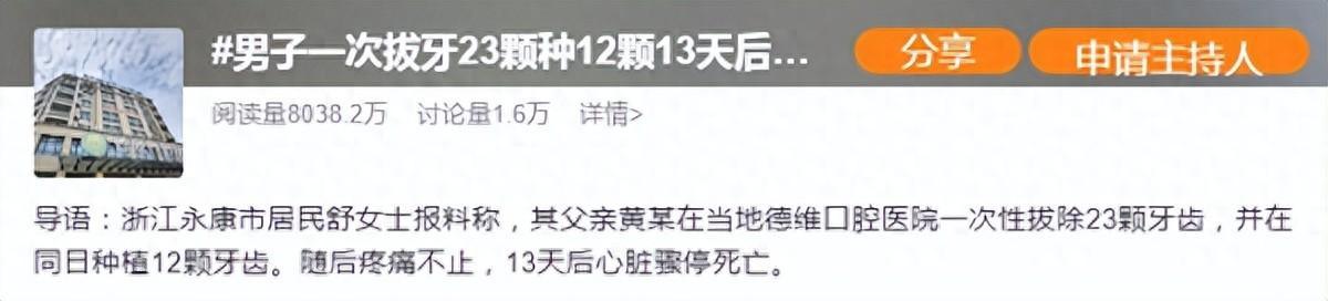 近日,浙江金華永康市一居民網上發文稱,其父親在當地德維口腔醫院一次性拔除23顆牙齒,並在同日種植12顆牙齒,隨後疼痛不止,13天后心臟驟停死亡。永康市衛生健康局工作人員稱,由於拔牙和死亡時間相隔13天,具體原因還在調查中。該事件一經報道,引發巨大關注,不少網友表示疑惑:拔牙還會有生命危險嗎?拔牙到底算不算手術?