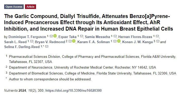 今年1月,美國佛羅里達農工大學的一篇新研究發現:大蒜素轉化的大蒜二烯丙基三硫化物有抑制苯並[a]芘等芳香烴受體的活性,減少DNA的損傷,預防癌變的作用,並認爲大蒜素對苯並[a]芘、亞硝胺等致癌物誘導的癌症有抑制效果。