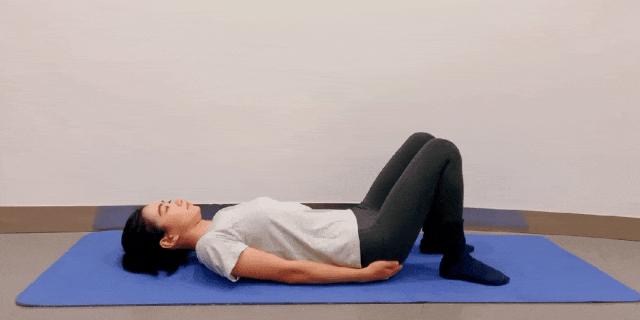 仰臥,背部和腳底放瑜伽墊上,頸部放鬆,雙手掌放在臀大肌上,可在訓練時感受臀大肌發力。