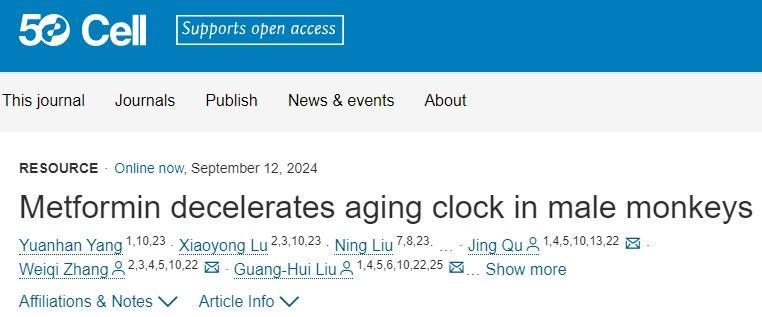 最近在頂級期刊《細胞(Cell)》上發表了一篇由中國科學院劉光慧、張維綺和曲靜領銜研究團隊的研究,通過觀察食蟹獼猴在進行二甲雙胍治療與對照組的表現,並定期進行大腦成像以及身心常規體檢,同時還登記了它們多個組織/器官的衰老情況,監測包括細胞層面在內的生物年齡的轉變。