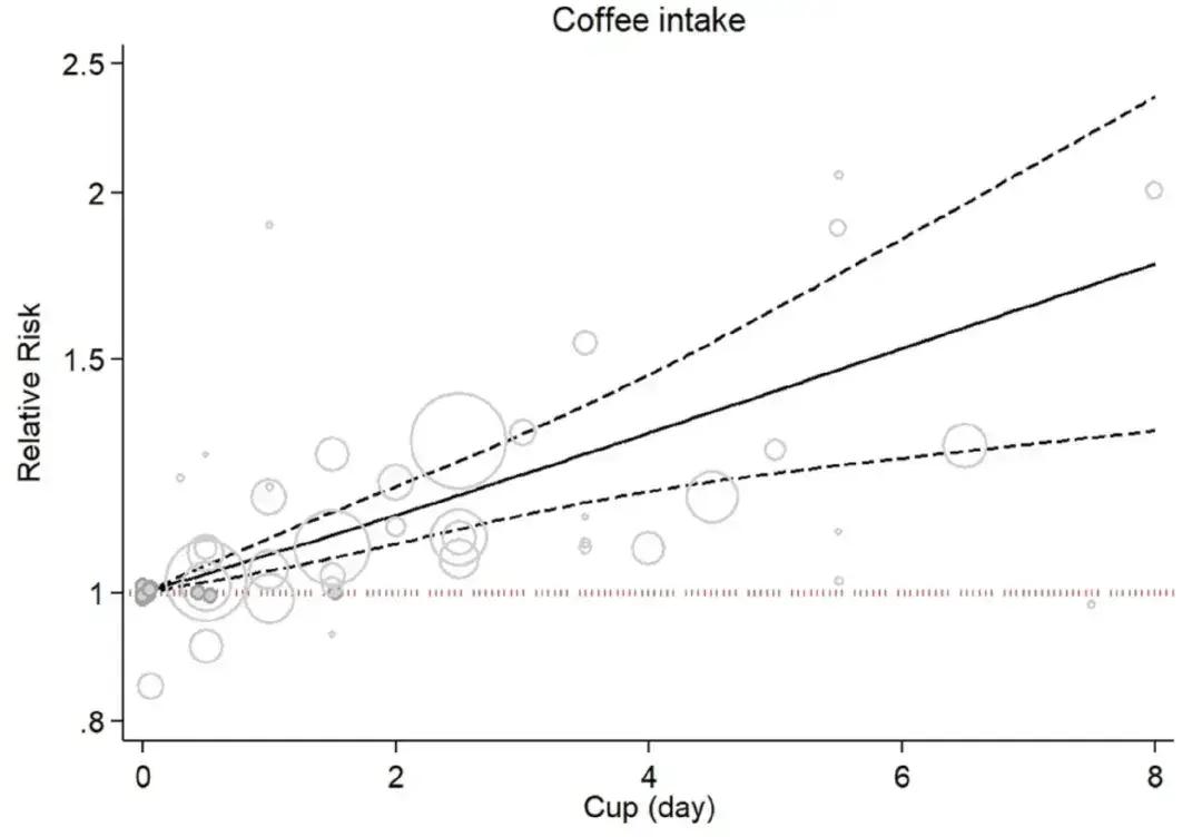隨着飲用量的增加(1-5杯/天),患肺癌的風險也會隨之提高。劑量反應顯示,每日多飲用一杯咖啡(約250毫升)會導致肺癌風險增加6%。