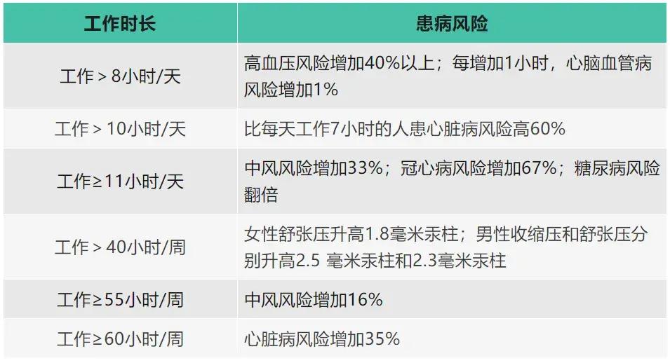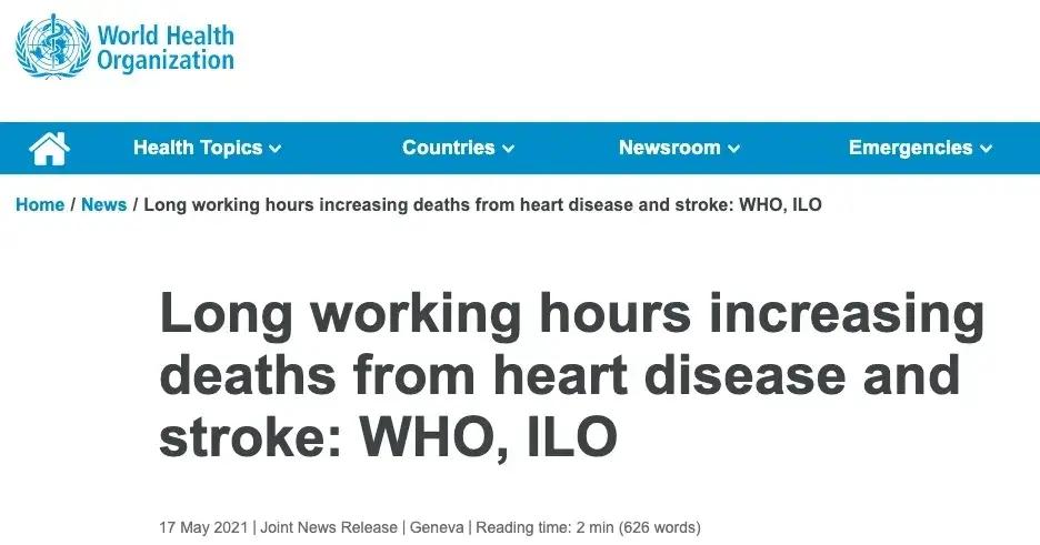 2021年,世界衛生組織和國際勞工組織聯合發佈全球首份關於“長時間工作對生命和健康影響的分析報告”,報告指出,每週工作55小時或以上的人,患中風的風險增加35%,死於缺血性心臟病的風險增加17%。