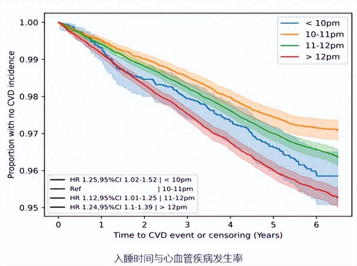 這項研究採用了來自英國生物樣本庫(UK Biobank)的8.8萬名參與者的數據,其平均年齡在43~79歲,女性佔58%。研究期間,參與者佩戴一種專門的手錶,以監測入睡和醒來的時間。研究者發現,入睡時間在午夜或更晚的人心臟病發病率最高,而在晚上10:00~10:59之間入睡的人患心血管疾病的風險最低。與10:00~10:59入睡的人相比,晚上11:00~11:59入睡的人患心血管疾病的風險高12%,在午夜或更晚入睡的人高25%,而晚上10:00之前入睡的人也要高出24%。