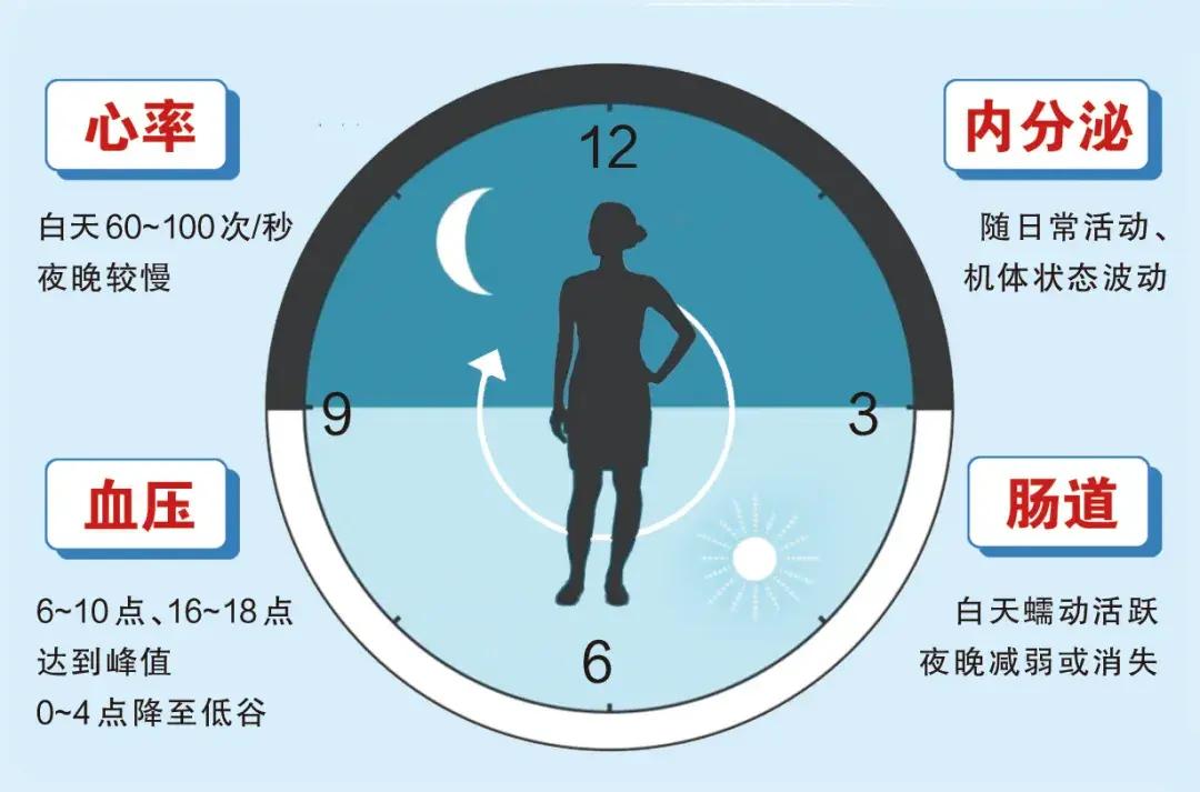 從心率快慢到血壓波動,從內分泌調節到腸道蠕動,各項生理活動的節奏都受生物鐘影響。舉例來說: