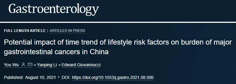 哈佛大學等機構的研究人員曾在《胃腸病學》上發表過一項研究,對我國健康與營養調查內的數據進行了分析,共納入1991~2011年參與了調查的2.7萬餘名成年人數據。中間共進行了8次隨訪調查,對受試者的身高、年齡、體重、性別、血壓血脂等基本健康信息進行了統計,並收集了吸菸狀況、飲食、體重指數等與12種癌症發生存在相關性的生活方式信息。