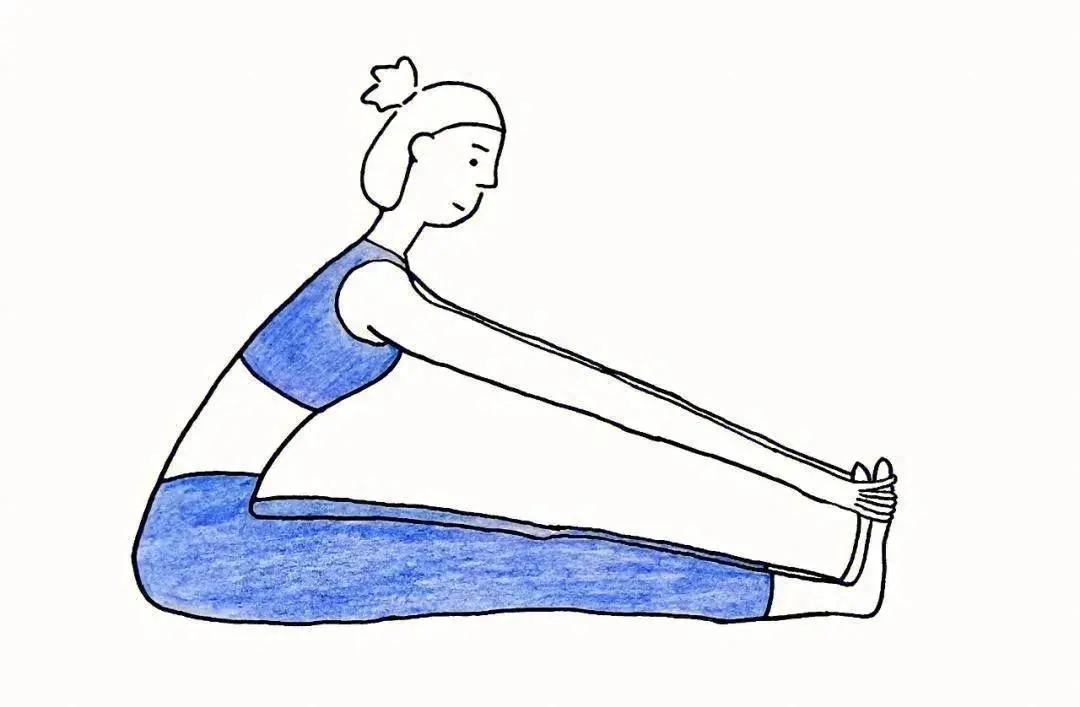 坐姿,雙腿伸直分開,腳尖回勾,雙手抓住腳趾,身體慢慢向下壓,重點感受兩腿內側被拉伸的感覺。